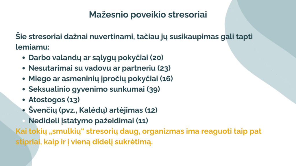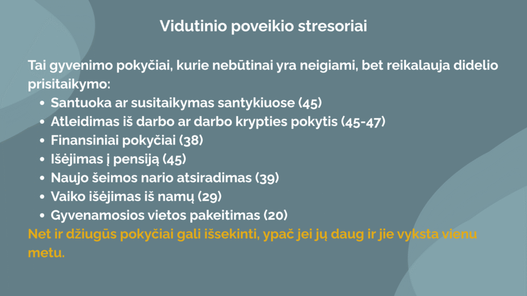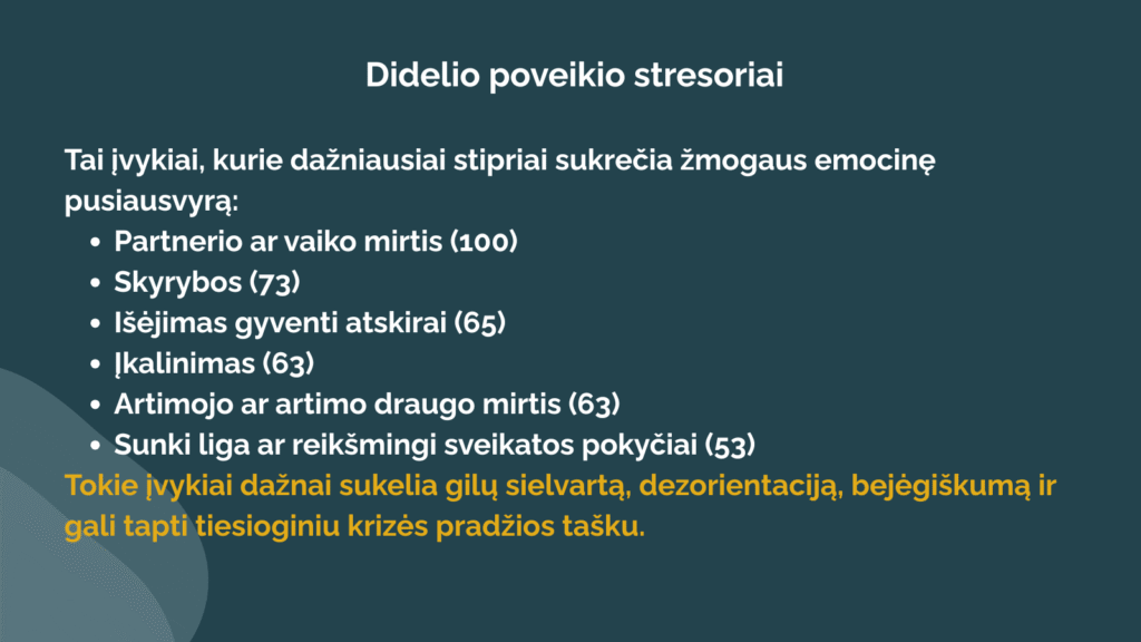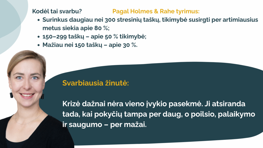Amerikos psichiatrai Thomas Holmes ir Richard Rahe sukūrė gyvenimo stresorių skalę, kuri parodo: ne visada psichologinę krizę sukelia vienas įvykis, kartais tai gali būti per tam tikrą laiką patirtų kelių pokyčių krūvio pasekmė. Taip pat iš žemiau pateikto stresinių įvykių sąrašo matysite, kad ne visi jie yra neigiamos patirtys – pozityvūs patyrimai taip pat reikalauja iš mūsų resursų jiems pasiruošti, įgyvendinti ir adaptuotis.